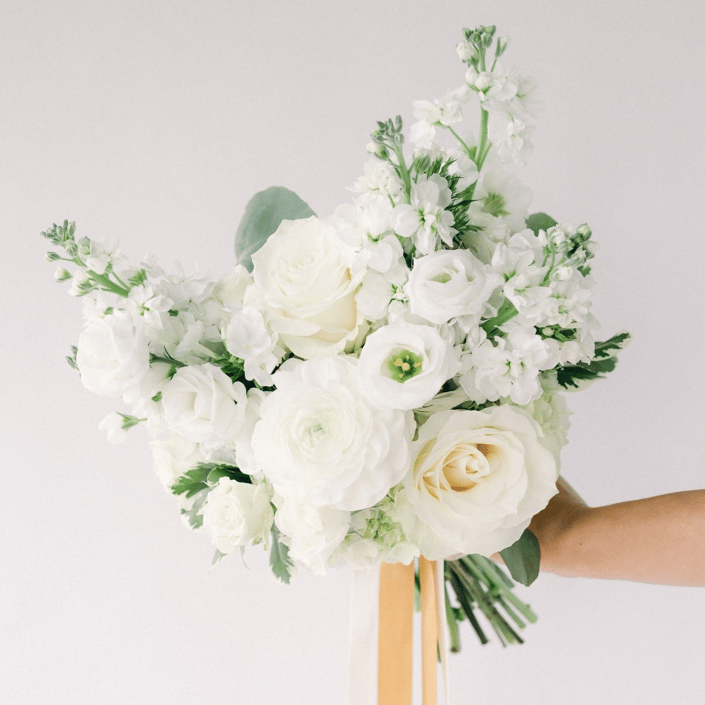 Элегантный, воздушный, нежный — букет невесты из роз, маттиол и эустомы для любительниц классики с добавлением современных трендов. Подходит почти для всех типов свадебных платьев.