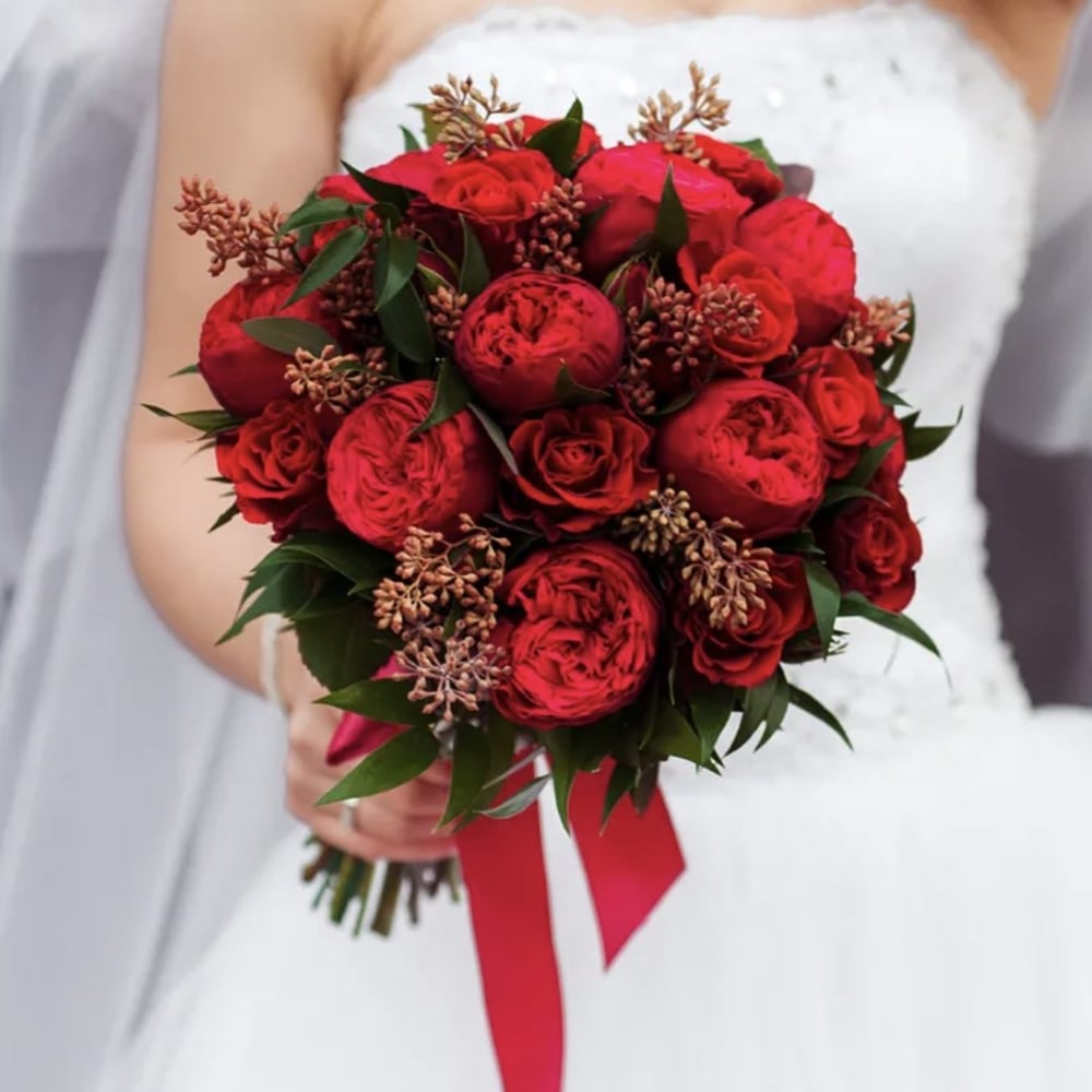 Розы, известные своей красотой и ароматом, создают романтическую атмосферу и являются символом любви и нежности. Элегантный букет невесты из красных роз для ярких и страстных девушек. Подходит почти для всех типов свадебных платьев.