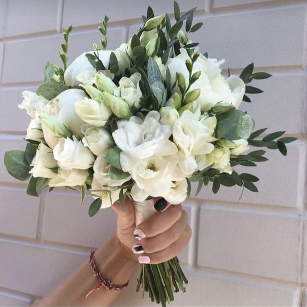 Классический букет невесты из роз, эустомы и фрезии с добавлением современных трендов. Сочетание разных структур и зелени придают букету уникальность и особый шарм. Отлично подойдёт практически для любого стиля свадьбы: от классики и минимализма до винтаж и французского стиля.