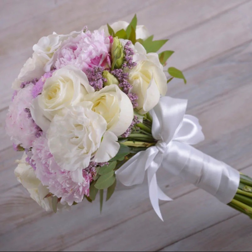 Нежный, интересный, современный, нетривиальный букет невесты с розами, гвоздиками эустомой и статицей. Необычное цветовое исполнение и классическая круглая форма подходят для свадеб разных стилистик: от классики и минимализма до винтаж и французского стиля.
