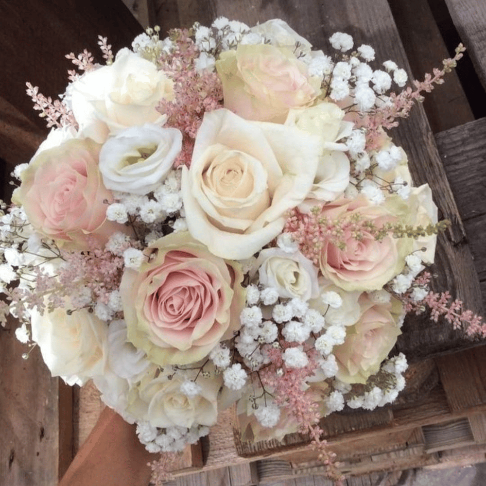 Нежный, интересный, современный, нетривиальный букет невесты с розами, эустомой, гипсофилой и астильбой. Необычное цветовое сочетание и классическая круглая форма подходят для свадеб разных стилистик