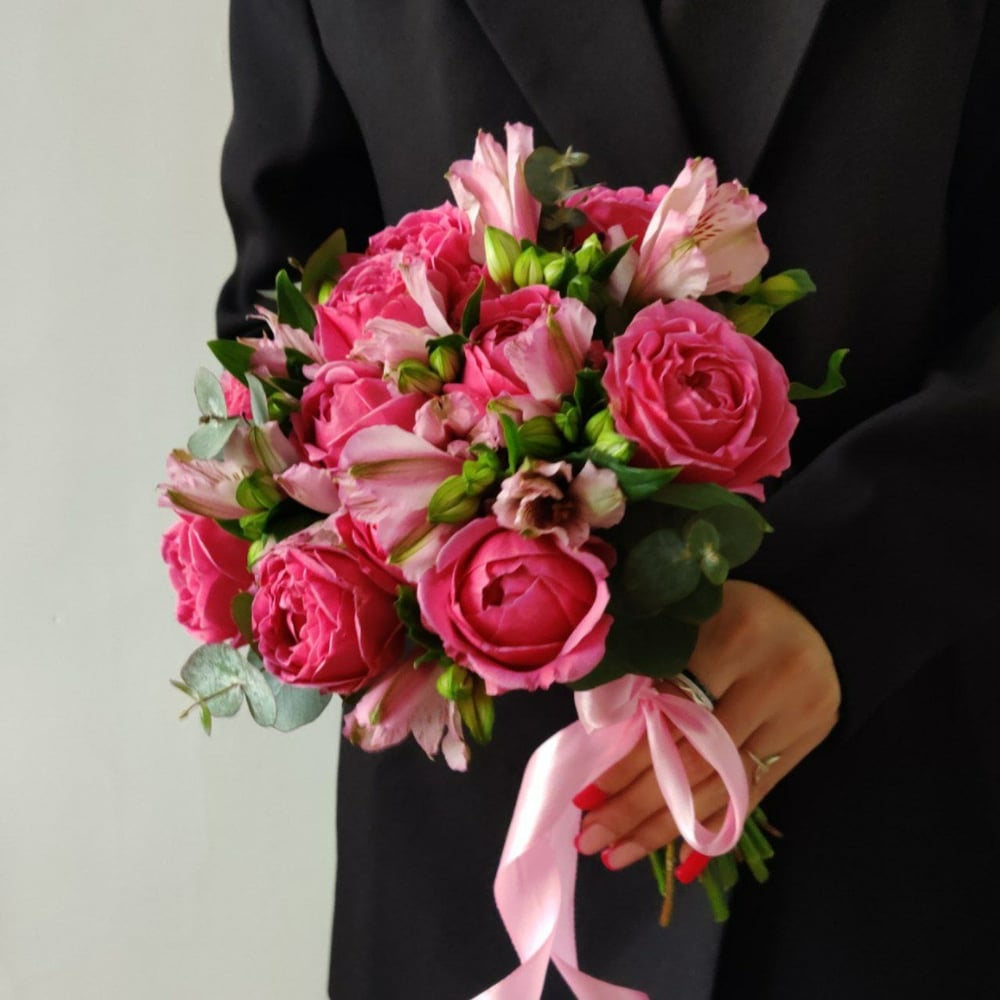 Этот изысканный букет невесты сочетает в себе нежность и элегантность, образуя гармоничную композицию из кустовых пионовидных роз и альстромерий. Розы, с их многослойными, бархатистыми лепестками в р…