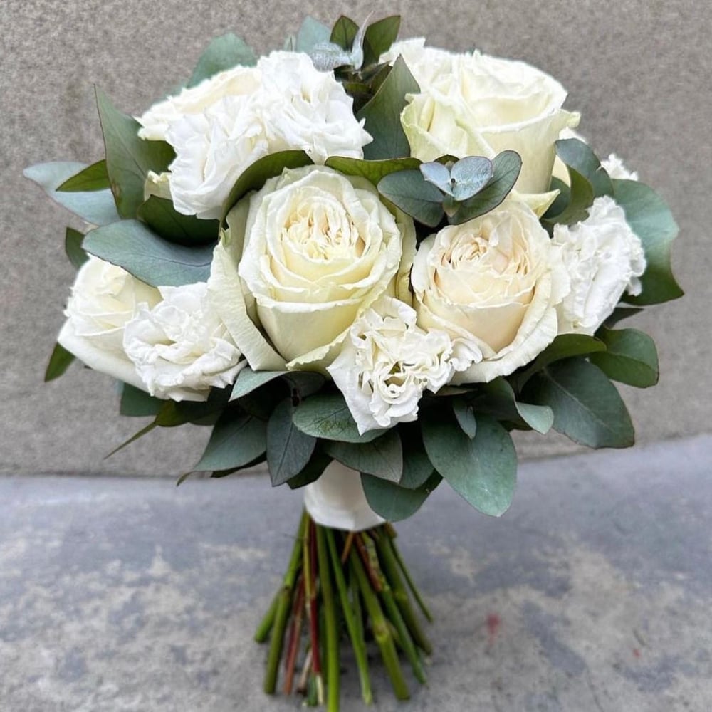 Невероятно утончённый и женственный букет невесты из пионовидных роз и эустомы с вставками эвкалипта подчеркнёт красоту и хрупкость будущей жены.