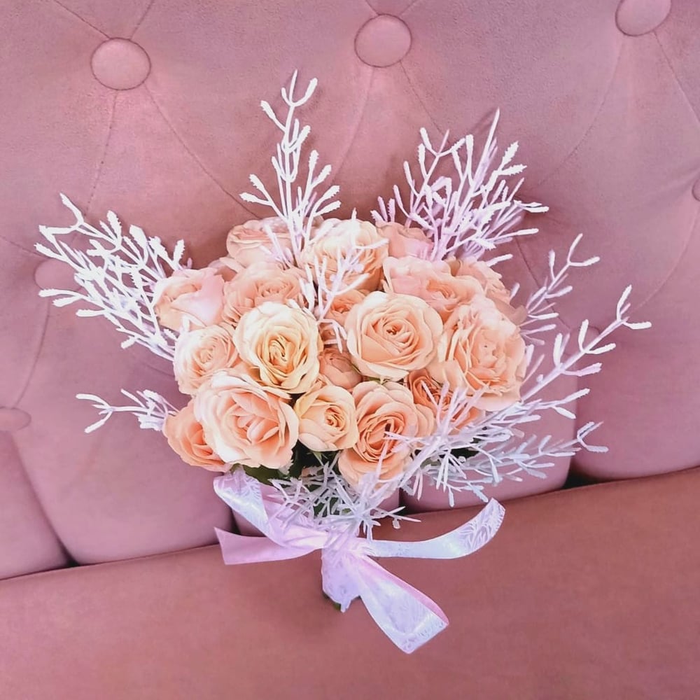 Букет невесты из кустовых роз классической форме в интересном исполнении. Оттенок бутонов и необычная декоративная зелень делают букет нетривиальным и выделяют его среди прочих.