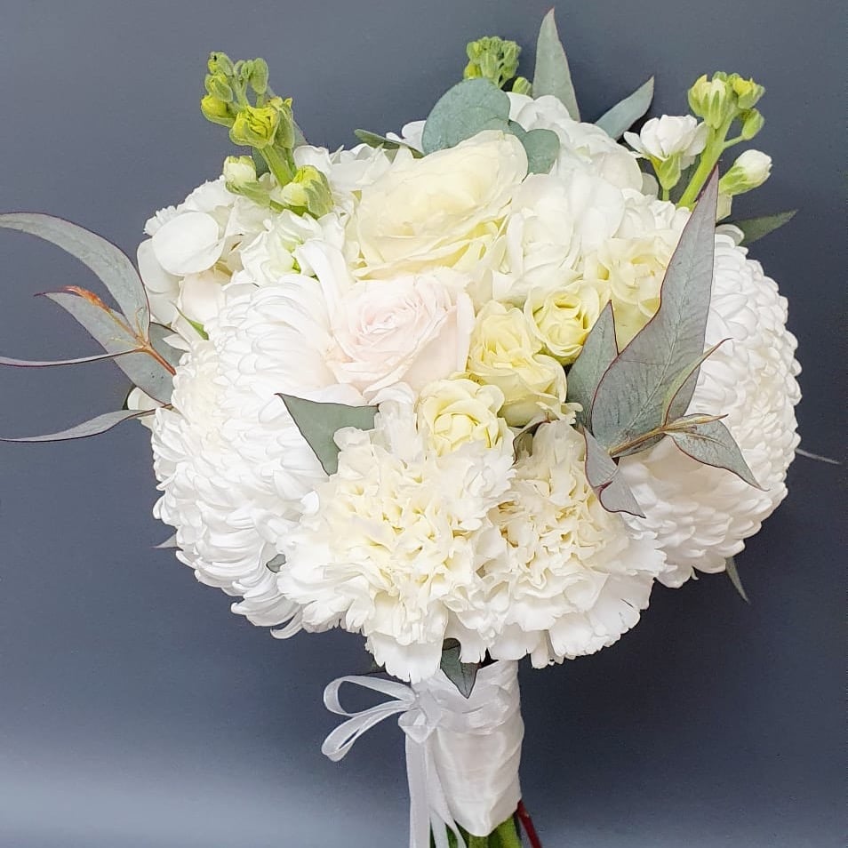 Романтичный букет невесты, в котором нежные розы, маттиолы и гвоздики гармонично сочетаются с воздушной хризантемой и ароматным эвкалиптом. Идеальное сочетание утончённости и естественности, подчёр...