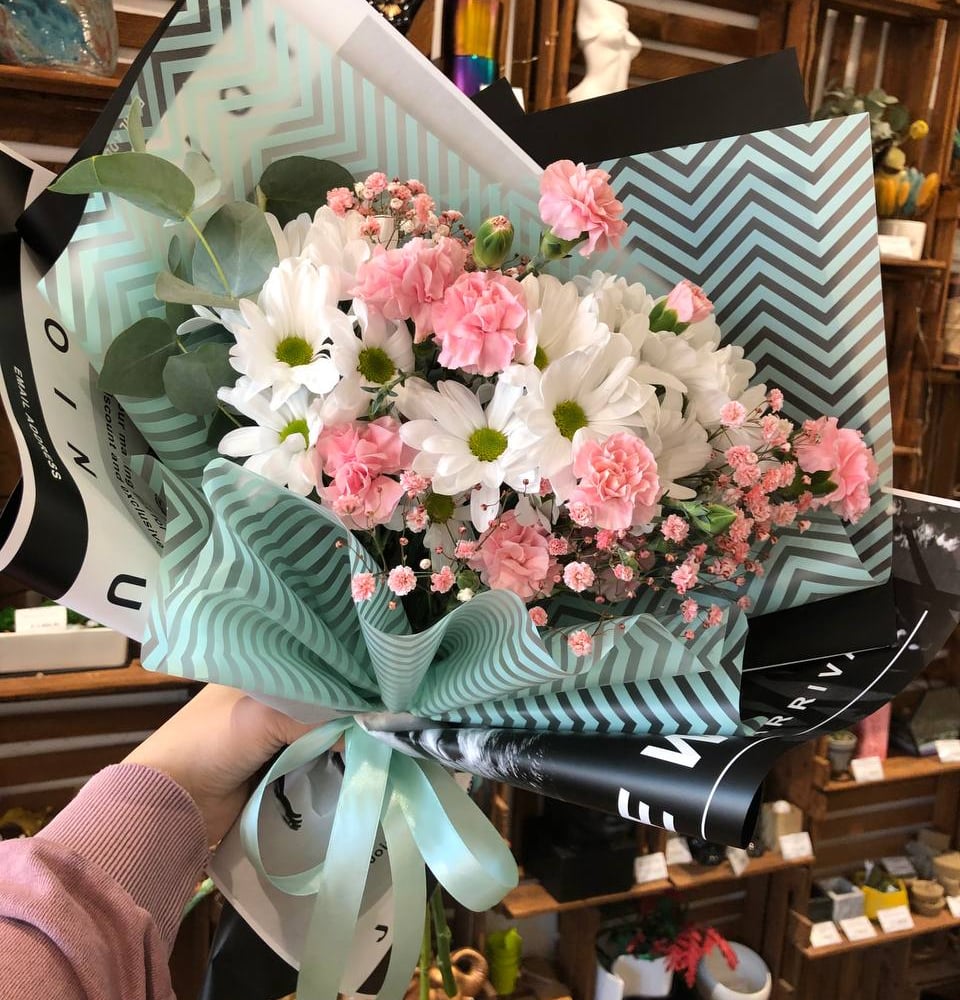 Кустовая хризантема с сочетанием нежных диантусов и зелени эвкалипт Стойкий ароматный букет с "ВАУ" эффектом