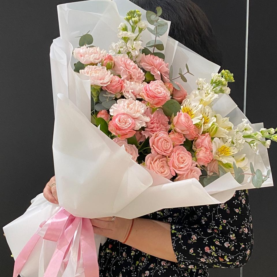 Этот изысканный букет включает в себя разнообразные цветы, такие как розы кустовые, гвоздики, маттиолы, альстромерии, а также ветки эвкалипта для добавления ароматической нотки. Каждый цветок тщате...