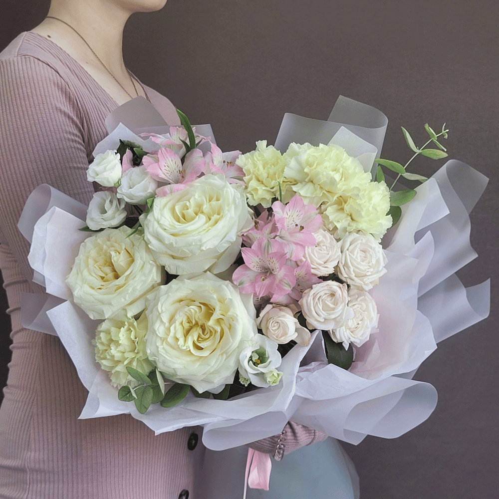 Букет "Нежный поцелуй" от цветочной мастерской "Мечта" воплощает в себе изысканность и элегантность, предлагая вам настоящий фейерверк чувств и эмоций через потрясающее сочетание пионовидных и куст...