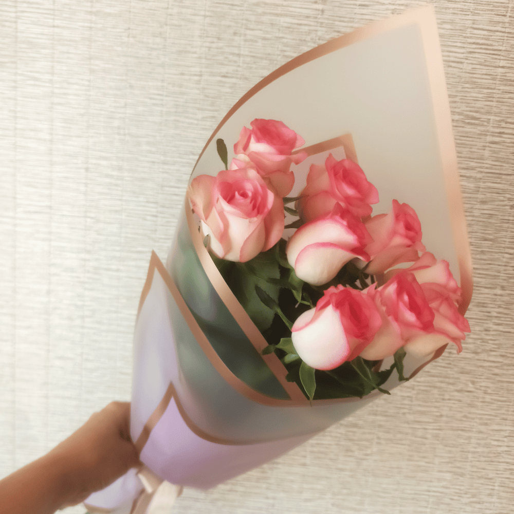 Букет из нежных роз бело-розового цвета, в дизайнерской упаковке в тон. Милый презент на день рождения или другой праздник, в подарок дочери или сестре. Приятный комплимент любимой девушке, жене.