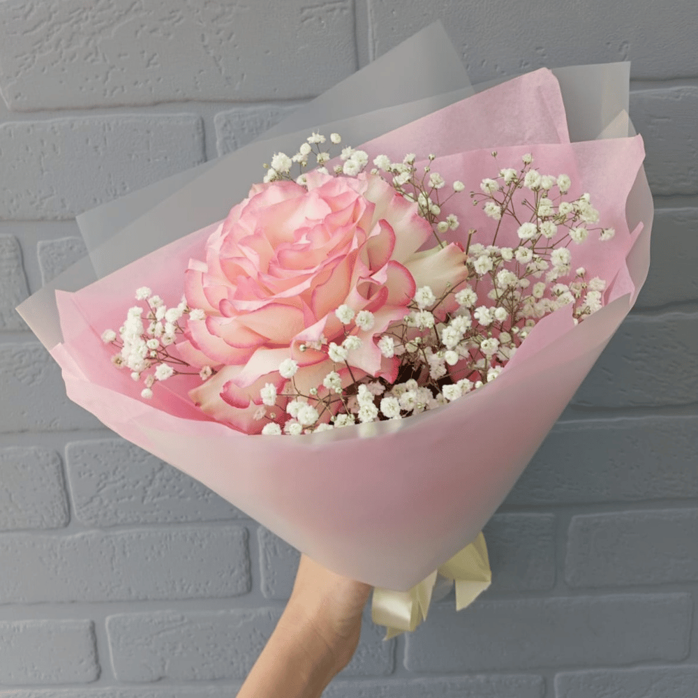 Букет из нежной ажурной розы, розового оттенка с гипсофилой, оформленный в воздушную матовую пленку с тишью