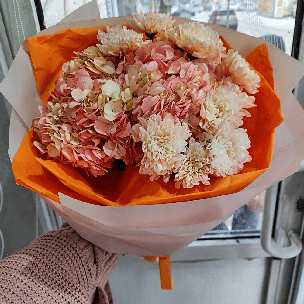 Букет оранжевых хризантем с гортензией