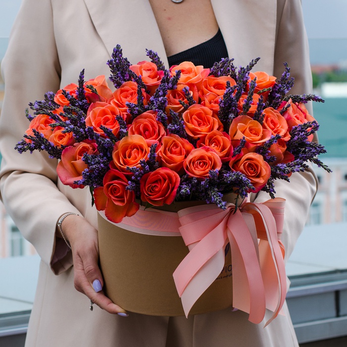 Шляпная коробка с цветами «Букет оранжевых роз в коробе со статицей»