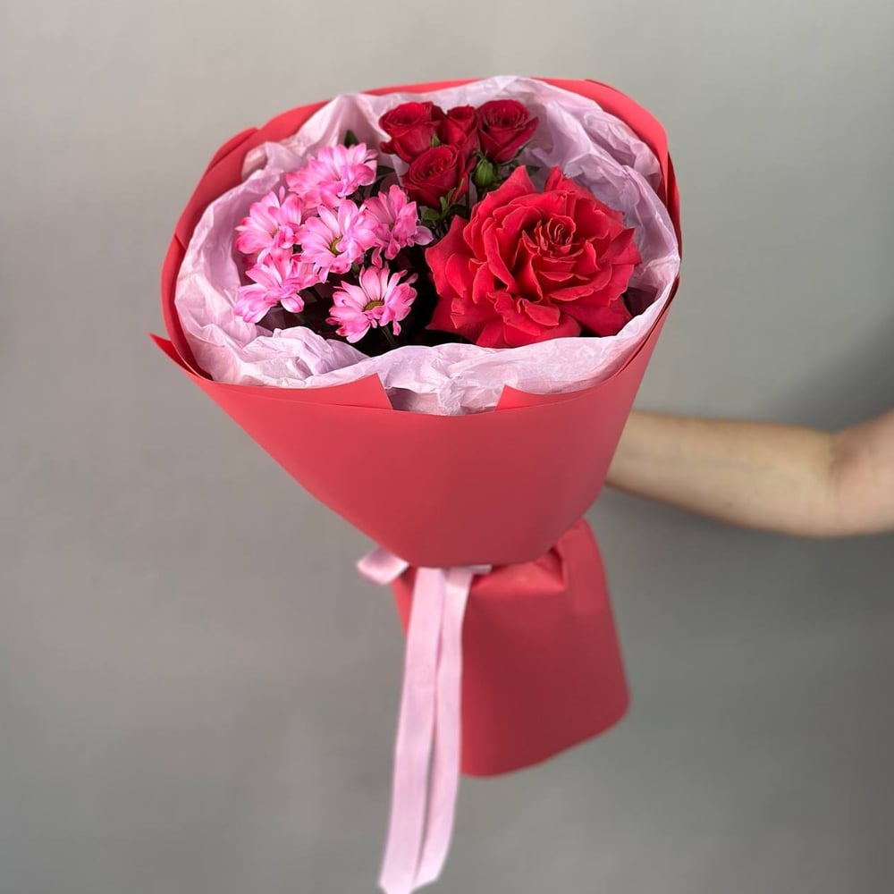 Сегодня мы поделелимся с вами чудесным букетом, который подарит радость и тепло каждому. В его составе — нежная Японская роза, обладающая утонченной красотой. Яркие хризантемы привносят радостные эмоции. Кустовая роза завершает композицию, даря невероятный шарм.