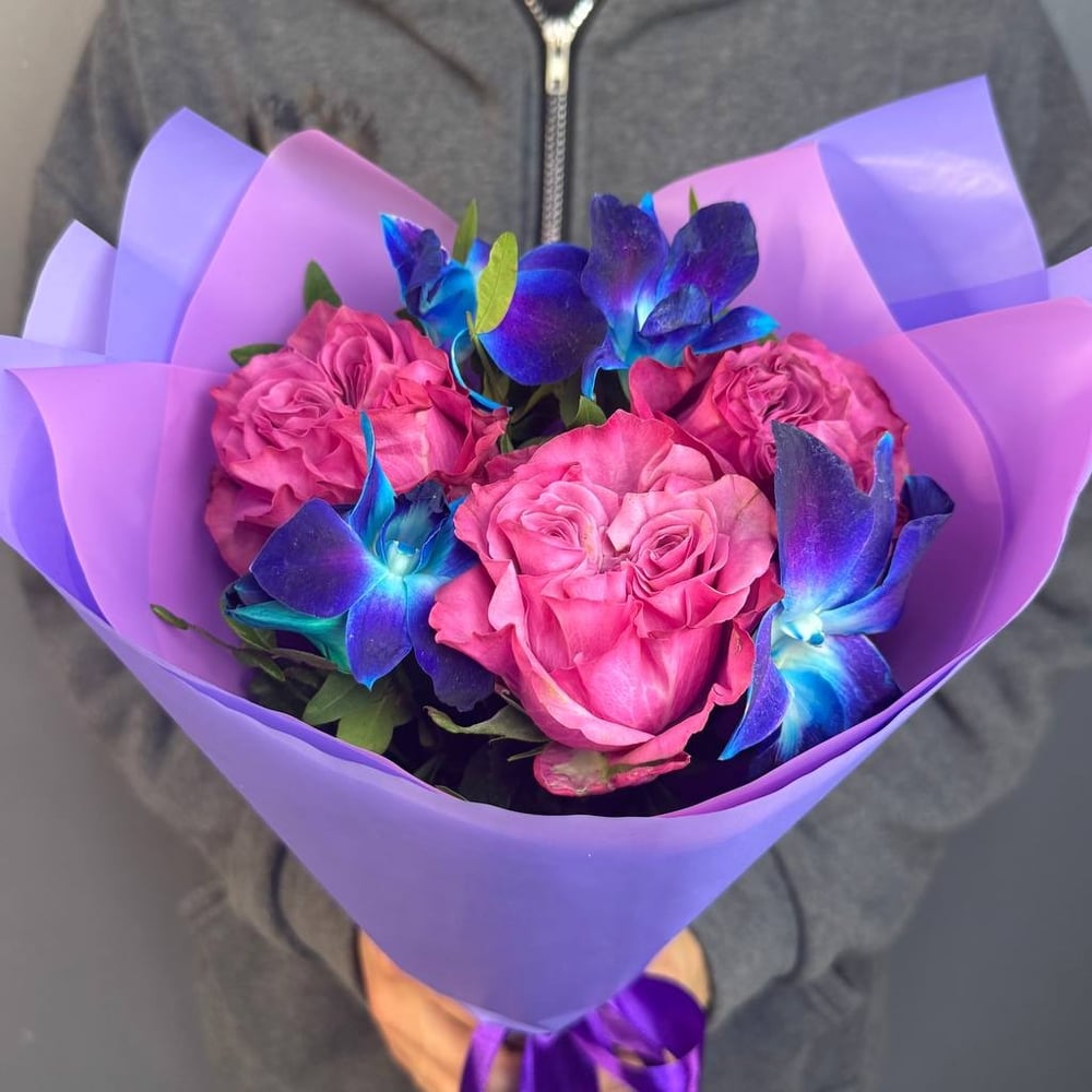 3 пионовидных розы розовые 3 орхидеи дендробиум синие флористическая упаковка фиолетовая