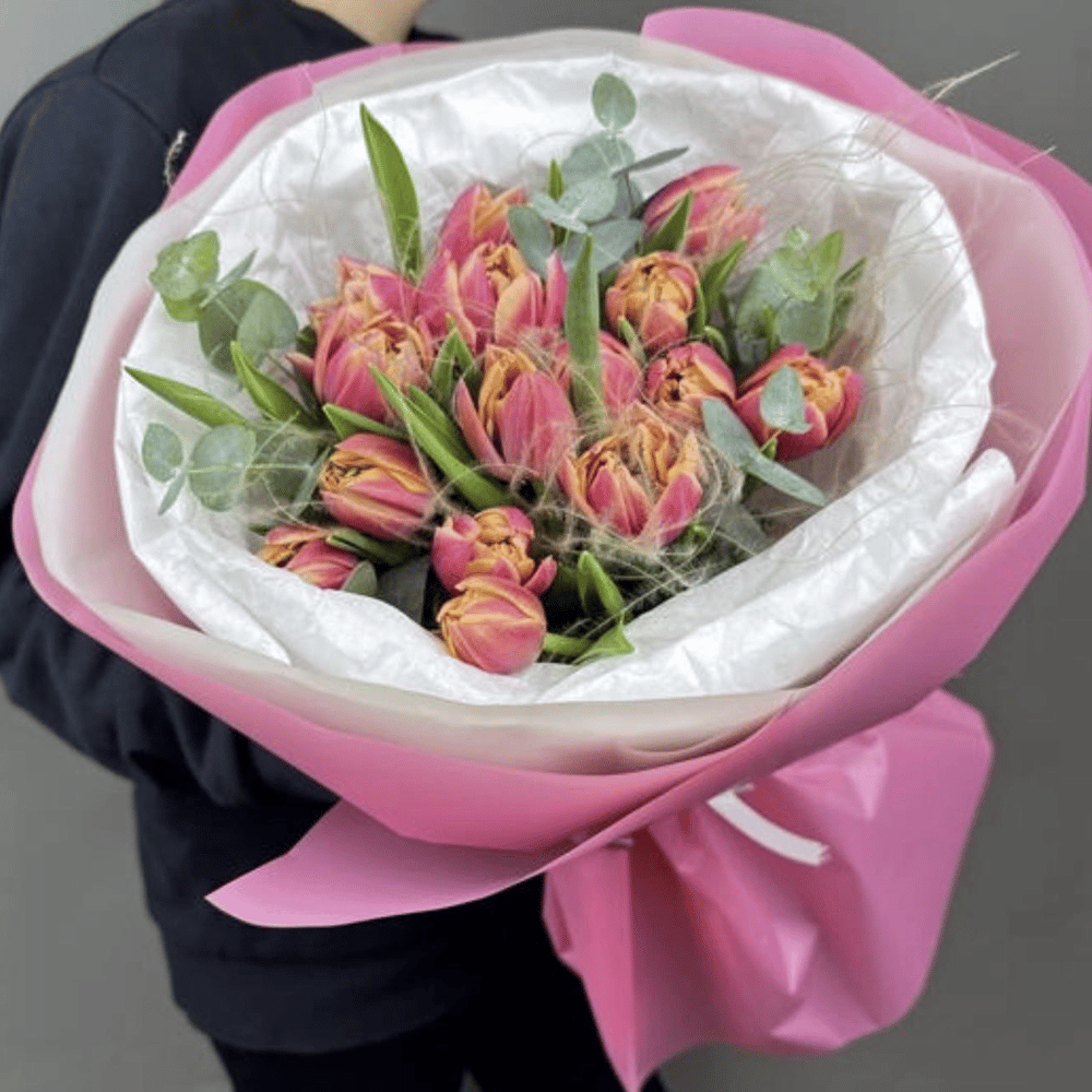 Букет из 15 пионовидных тюльпанов с эвкалиптом