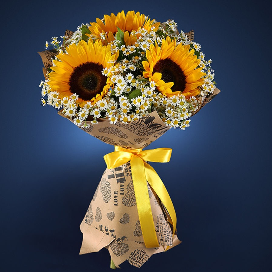 Букет с ярким и солнечным настроением, в котором главные герои - прекрасные подсолнухи. А ромашки добавляют букеты легкости и очарования. Такой букет станет отличным подарком для любого случая, он заполнит комнату своим светом и позитивной энергией.