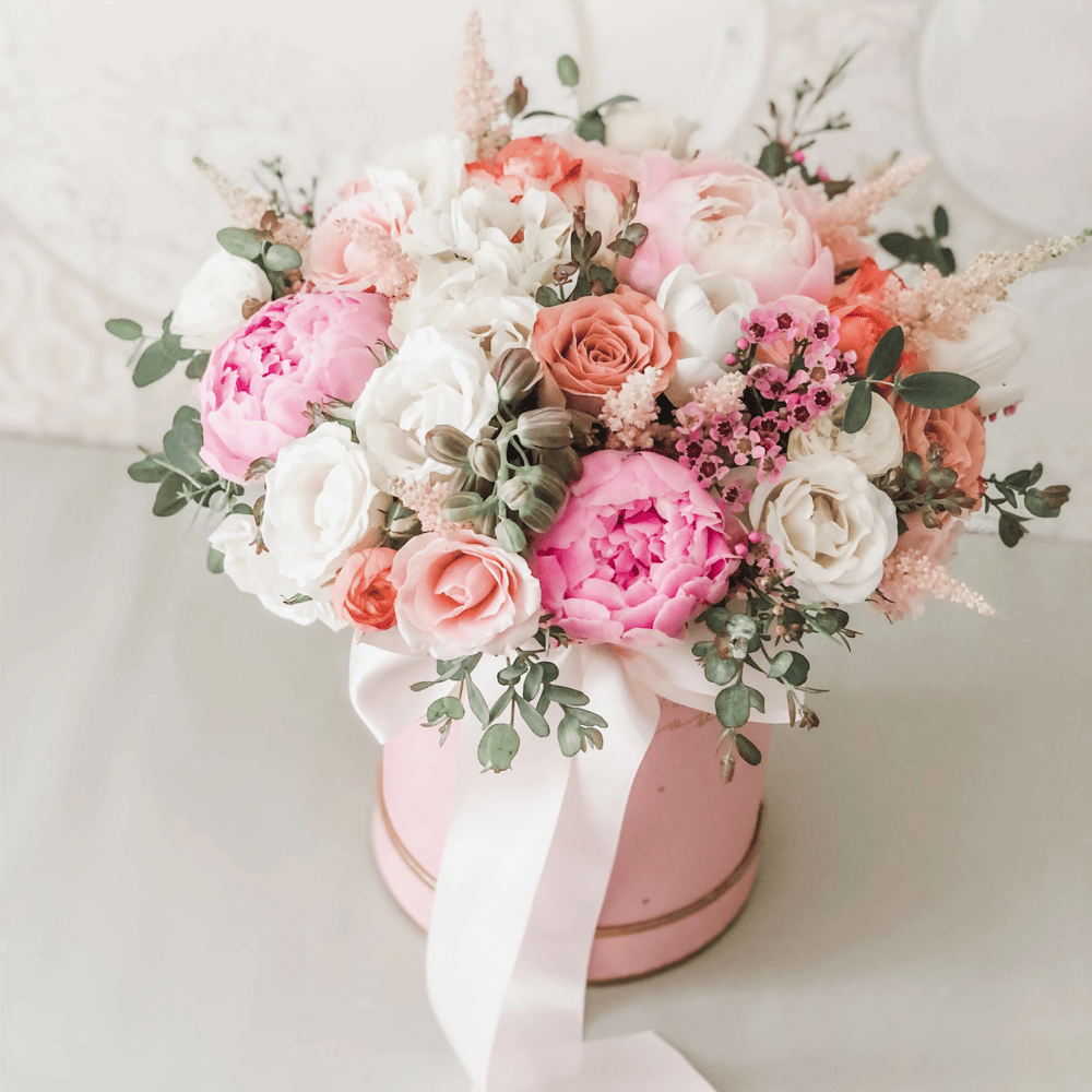 Авторская композиция в шляпной коробке с утонченном составом из роз и пионов с добавлением зелени. Розы, известные своей красотой и ароматом, создают романтическую атмосферу и являются символом люб…