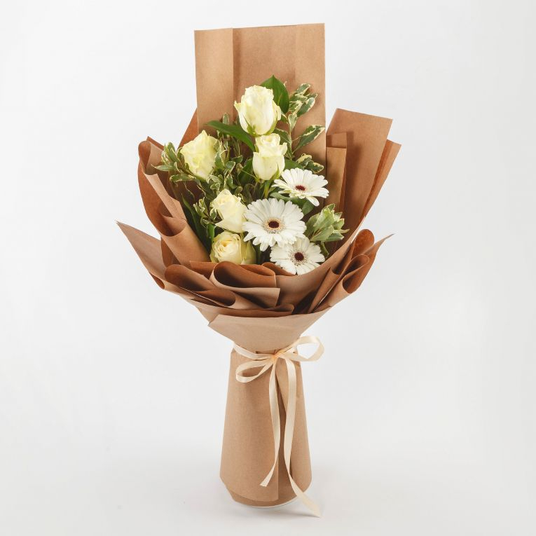 Белые розы и белые герберы - беспроигрышное, классическое сочетание, которое найдет путь к женскому сердцу. Элегантные и вместе с тем нежные цветы станут чудесным подарком и украшением любого праздника.