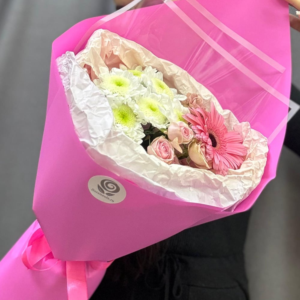 Прекрасный и воздушный букет, который будет отличным подарком для любого праздника или события. Букет упакован в пленку, чтобы сохранить свежесть и красоту цветов долгое время. Этот букет станет ярким и запоминающимся презентом, идеальным подарком для счастливого человека и для любого случая. Хризантемы символизируют верность, благородство, скромность, умиротворение. Роза символизирует таинство знания и мудрость Гербера является символом удачи и счастья, радости и хорошего настроения. Даже один цветок способен вызвать положительные эмоции