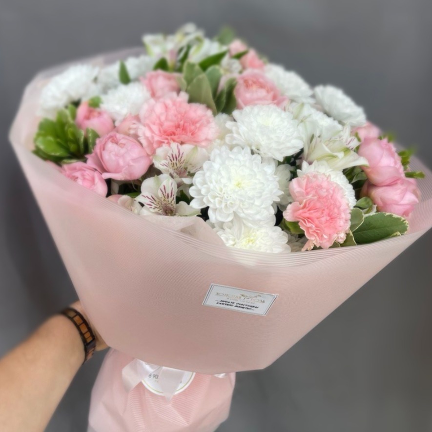 Шикарный букет из кустовой пионовидной розы, альстромерии, кустовой хризантемы и диантуса и веточек питоспорума - это отличный выбор. Букет выглядит изящно, воздушно и очень нежно. Это тот букет, который обязательно запомнится Вашему получателю 🎁 😍 Добавляйте товар и наш магазин в избранное, чтобы было легче нас найти. Как ухаживать за цветами? 💐 🔹Держите цветы подальше от сквозняков и приборов отопления. 🔹Ежедневно обновляйте свежую воду в вазе и подрезайте стебли на 1-1,5 см. 🔹Не оставляйте букет без воды на время более 15 минут. У нас так же можно приобрести хризантемы, розы, лилии, лизиантусы, эустомы, тюльпаны, гортензии, розы кустовые, альстромерии, ромашки, надувные шары, конфеты, сладости Доставка цветов в Омске и Омской области.