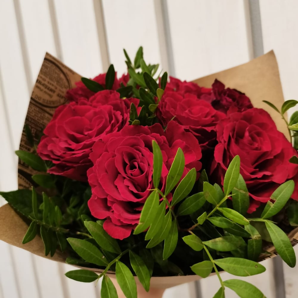 Любимые розы красно-бордового цвета в современной дизайнерской крафт упаковке. Немного букетной зелени, красная лента и стильный букет полностью готов! Подойдет для подарка молодой девушке, женщине или как знак уважения мужчине.