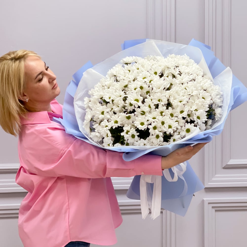 Букет из 25 белоснежных хризантем в современной упаковке подарит своей обладательницы море радостных эиоций!