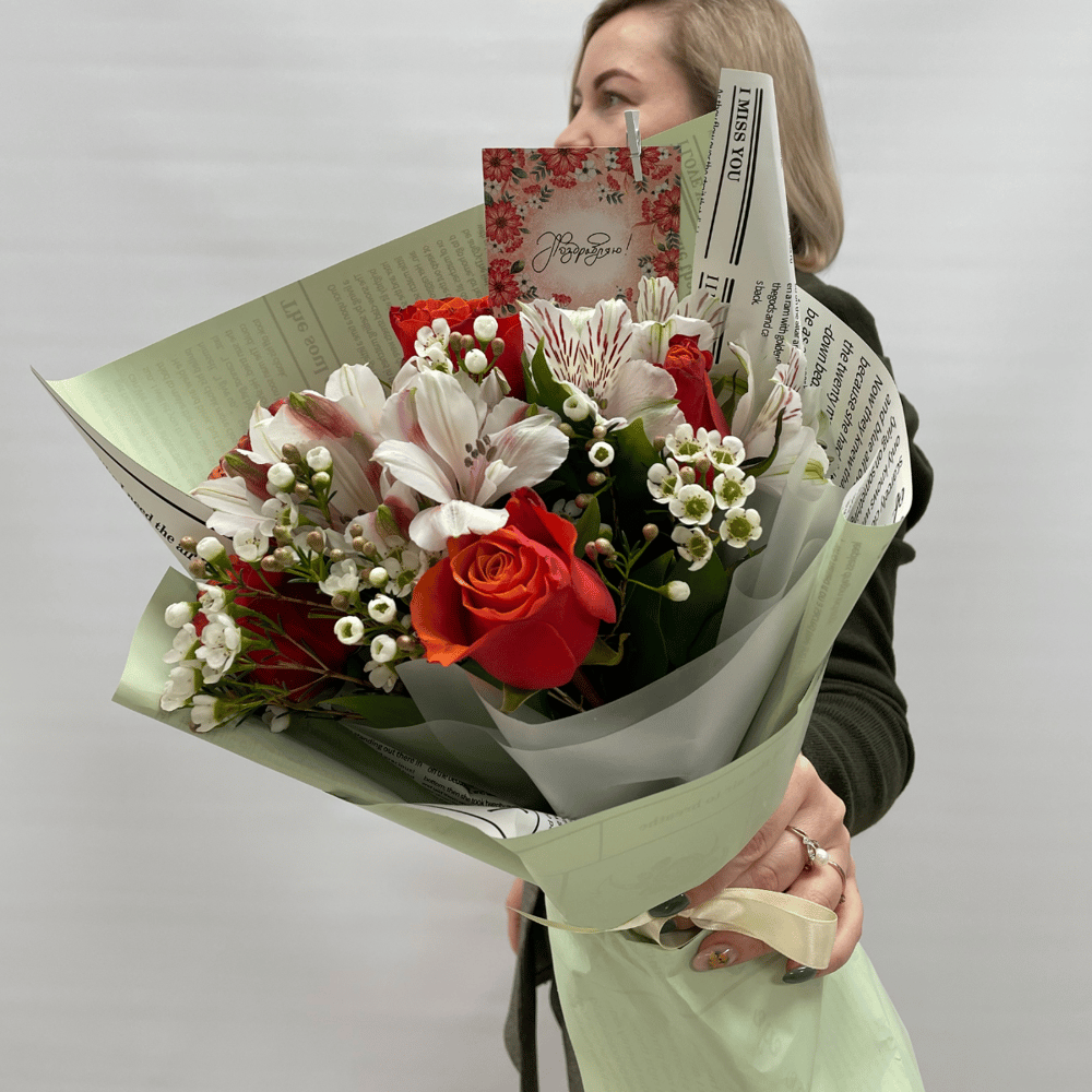 Букет Роз, Альстромерий и Хамелациума