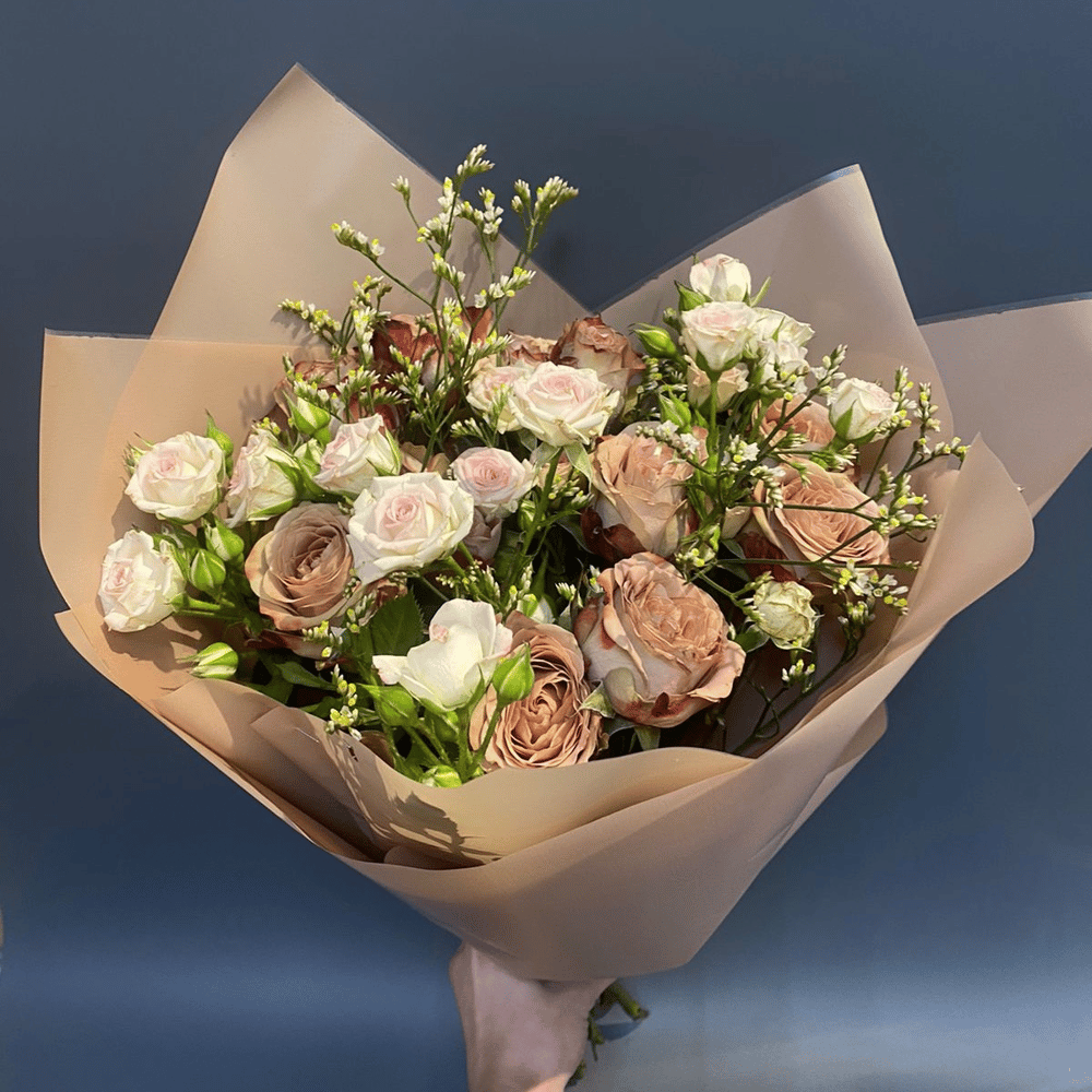 Этот нежный букет состоит из красивых роз и лимониума, что создает яркий и воздушный образ. Упакованный в элегантную упаковку, этот букет станет отличным подарком для любого повода - от дня рождения до свадьбы. Порадуйте своих близких с этим прекрасным букетом.