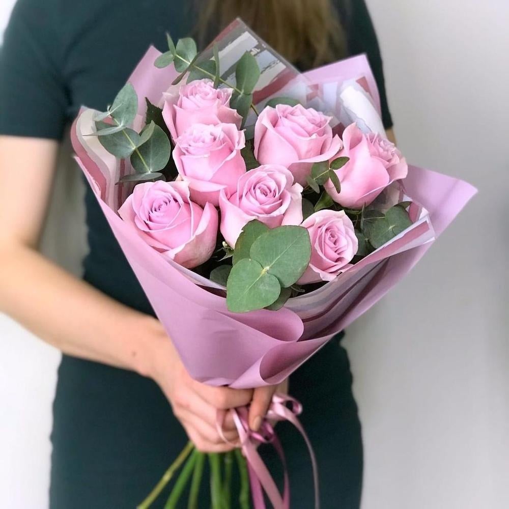Букет в упаковке с ключевым акцентом на 7 красивых розовых роз. Розы - символ любви и нежности, каждая из них сияет своим собственным уникальным обаянием. Ветви эвкалипта подчёркивает красоту роз и добавляют букет свежести и оригинальности. Упаковка дополняет элегантность букета и защищает цветы от повреждений во время доставки. Этот букет будет идеальным подарком, который дарит тепло и улыбку своему получателю.