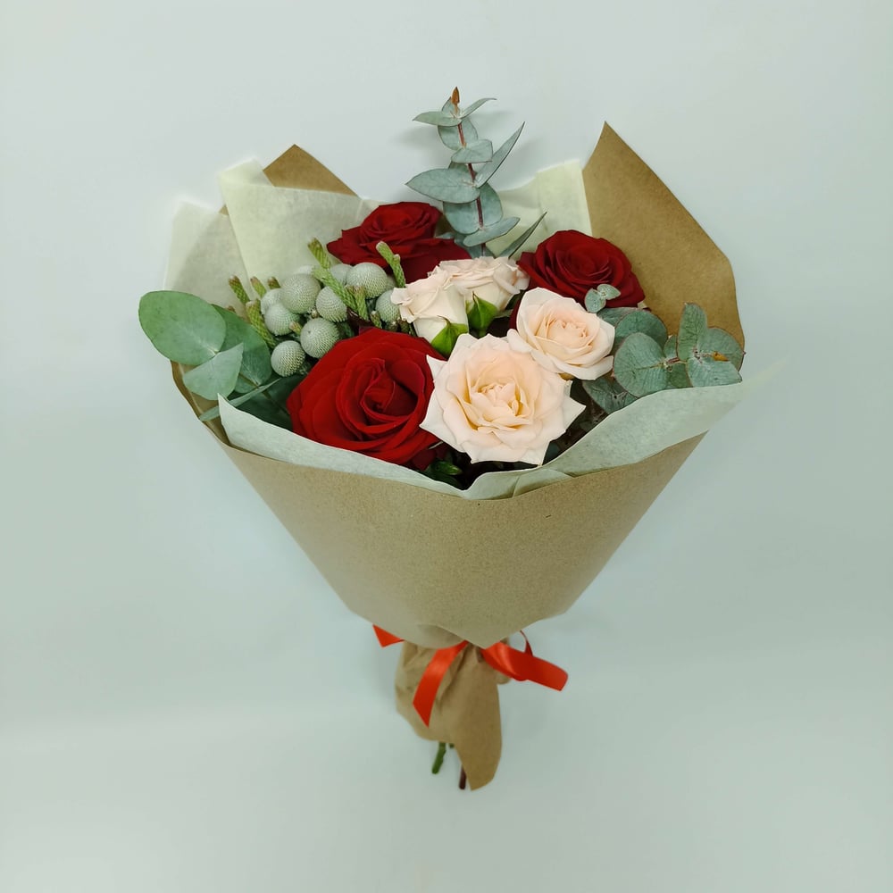 Нарядный букетик роз в упаковке из крафта и тишью, украшен веточками брунии, эвкалипта и атласной лентой.
