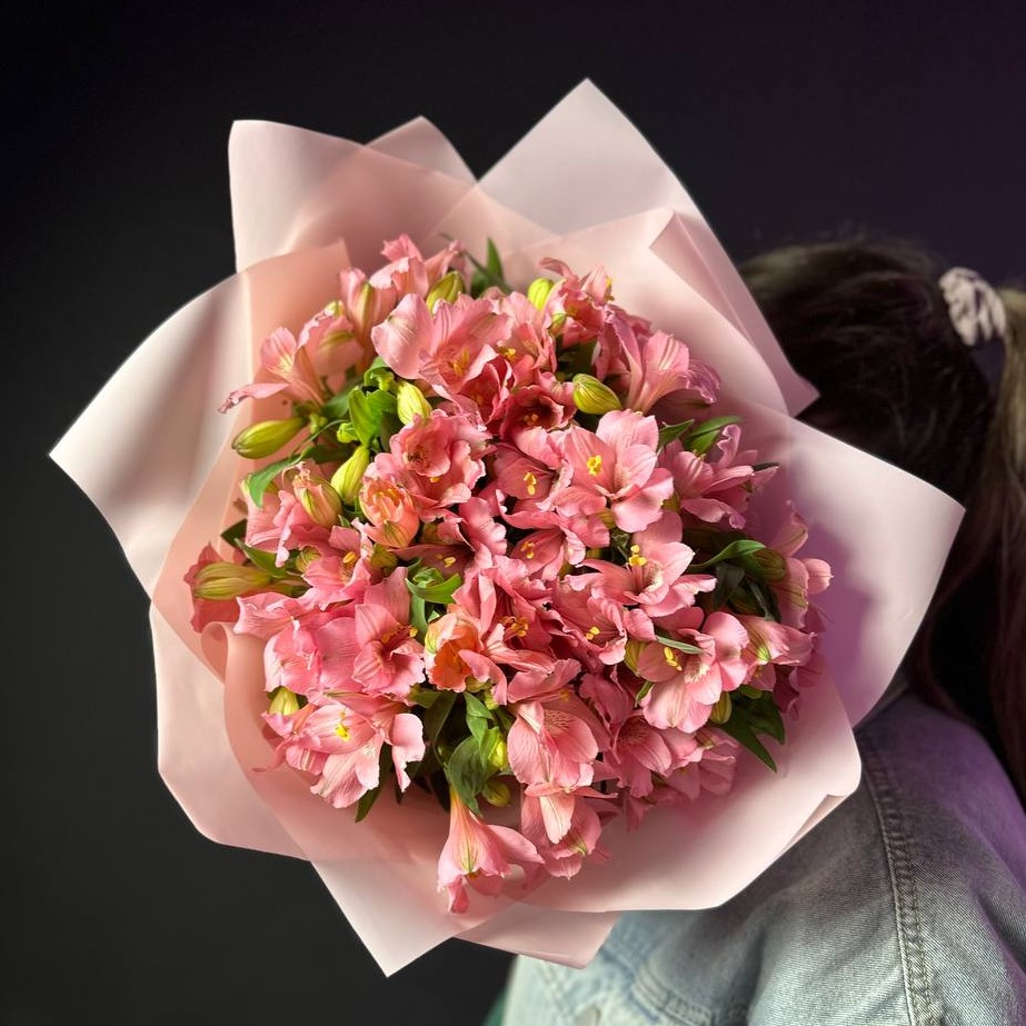 Стойкие альстромерии в розовой упаковке. К каждому букету в подарок приложим Кризал, сделаем аквабокс и подпишем открытку, если потребуется