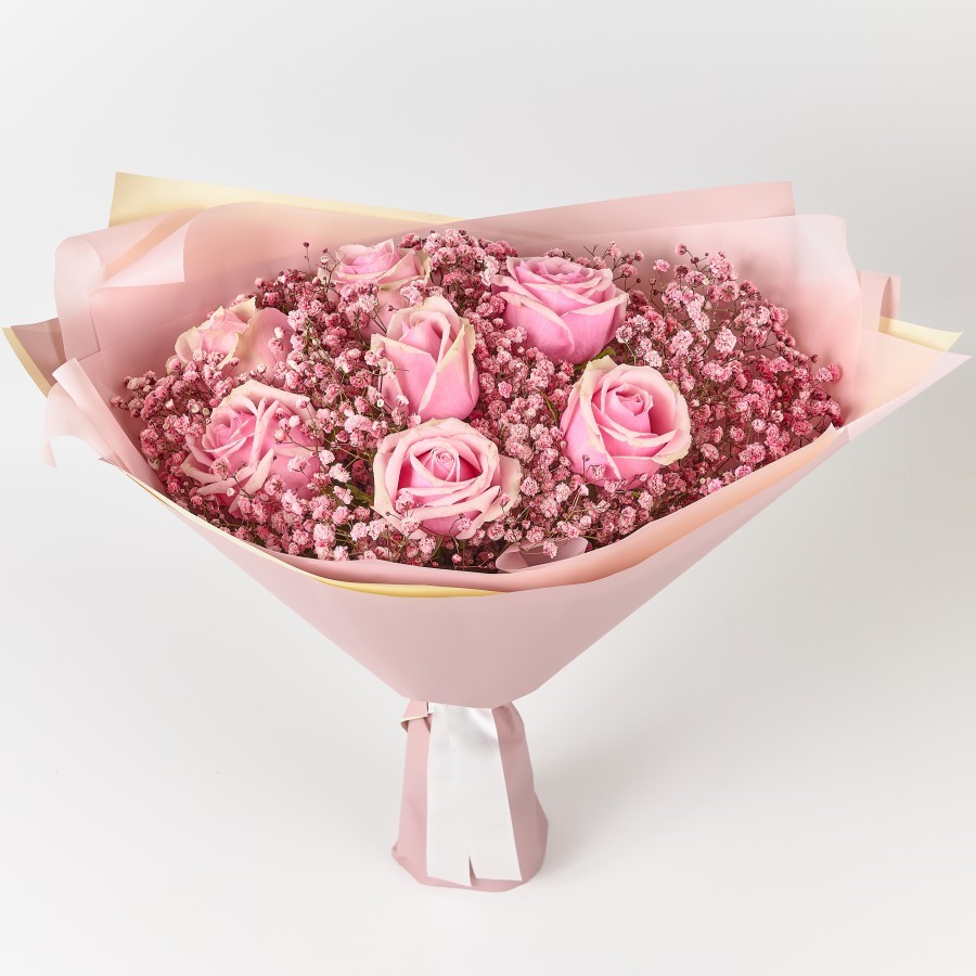 Букет розовых гипсофил и роз небольшой