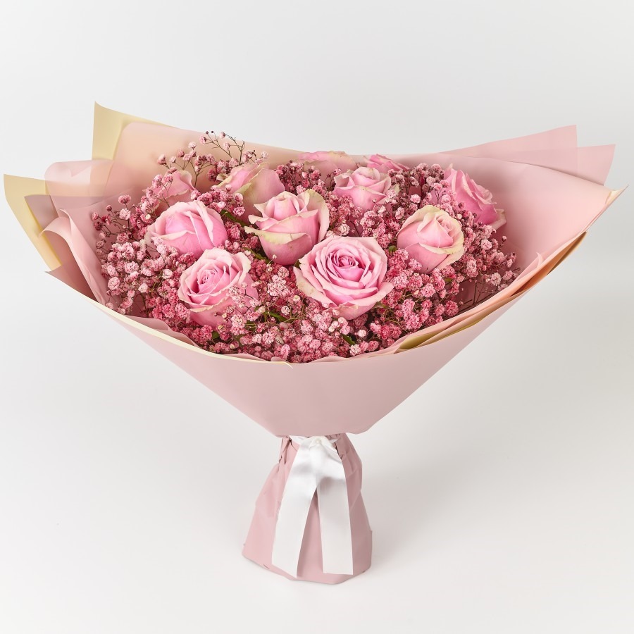 Букет розовых гипсофил и роз средний