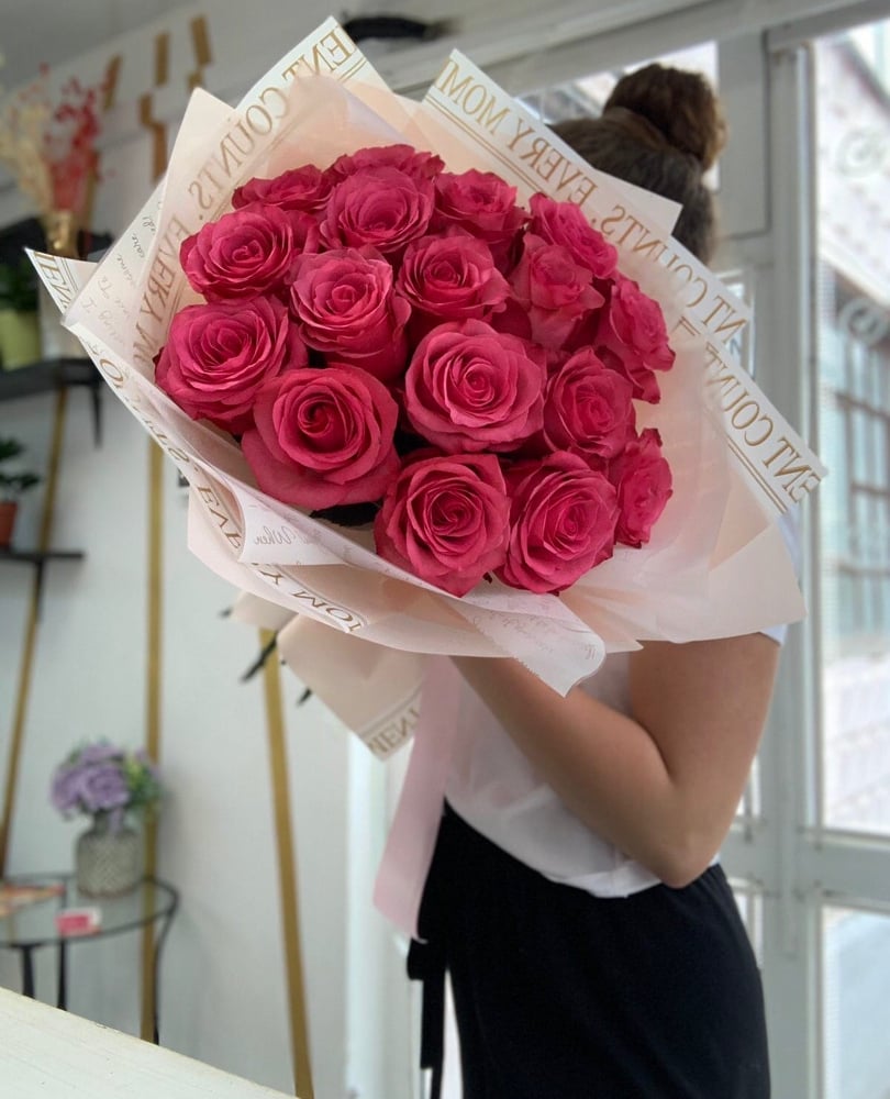 Розовые розы Эквадор LUXE- крупный бутон. Розы оформлены в стильную упаковку, которая подчеркивает красоту цветов.
