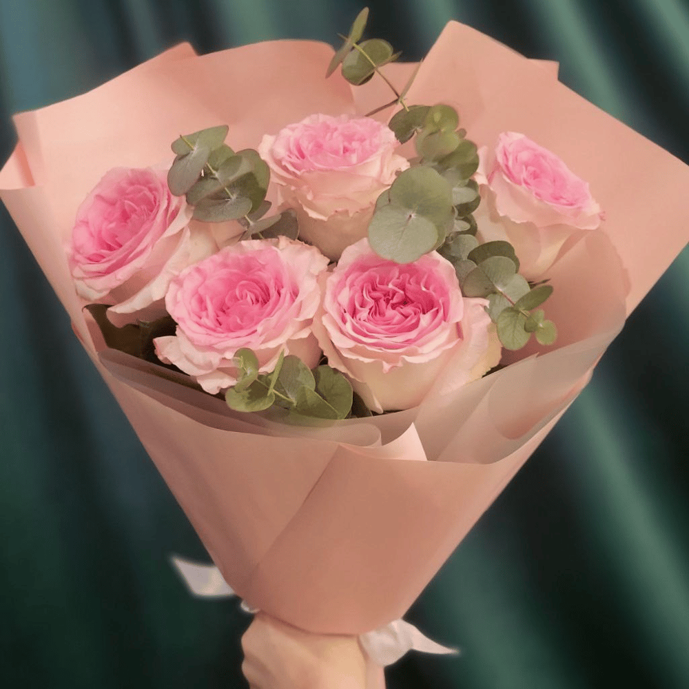 5 пионовидных роз и 3 эвкалипта в упаковке. Высота роз 50 см. Стойкий Эквадорский сорт. Красивая расцветка.