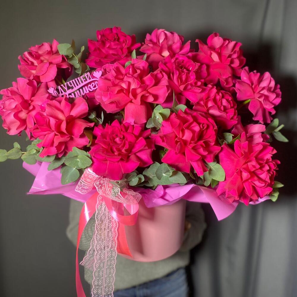 Шляпная коробка с цветами «Букет розовых роз в коробе»