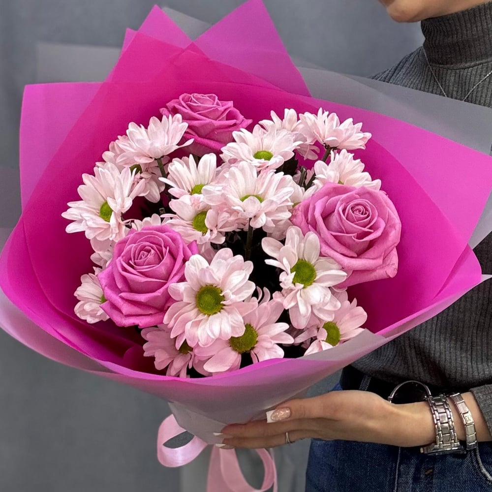 Этот нежный и элегантный букет состоит из красивых хризантем кустовых и утонченных роз. Этот букет станет отличным подарком для специального человека в вашей жизни и порадует его свежестью и красотой.