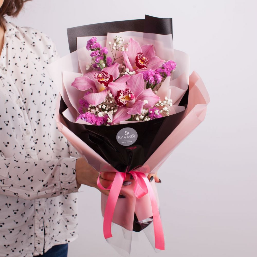 Букет с цимбидиумом "Юнона" из орхидей и гипсофил