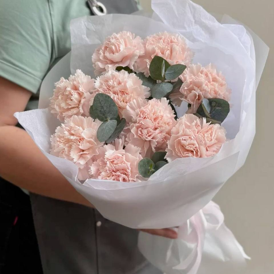Букет из 9 розовых диантусов с эвкалиптом в авторской упаковке