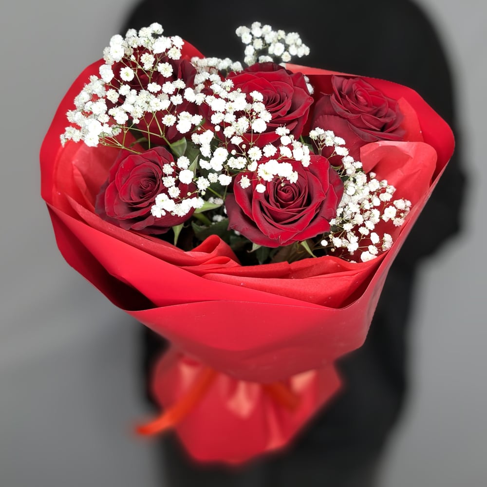 Яркий и очаровательный букет, сочетающий в себе красные Эквадорские розы и белую гипсофилу - настоящая классика.