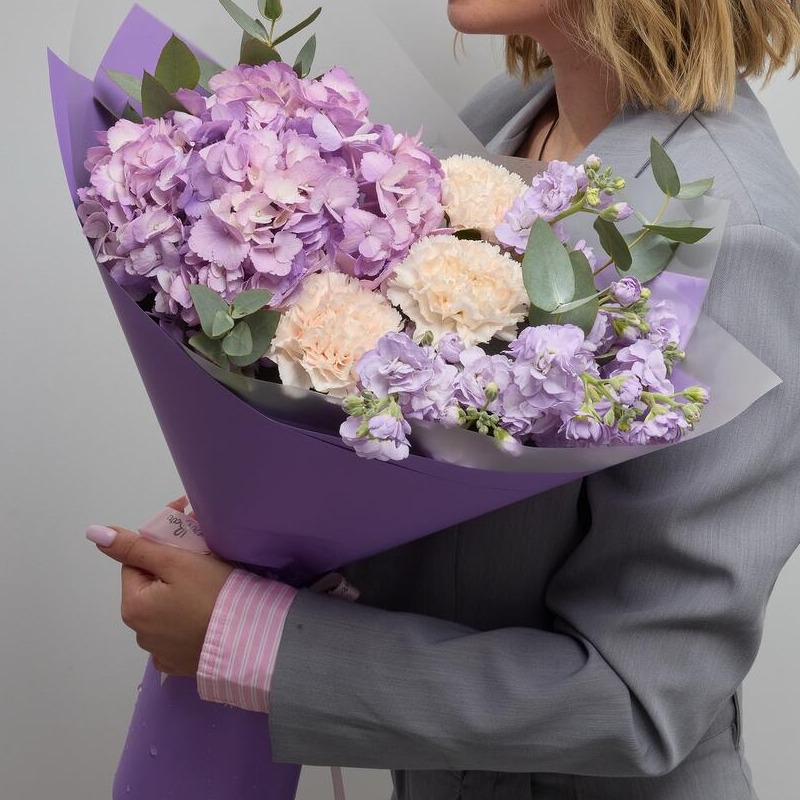Букет с фиолетовой гортензией и маттиола