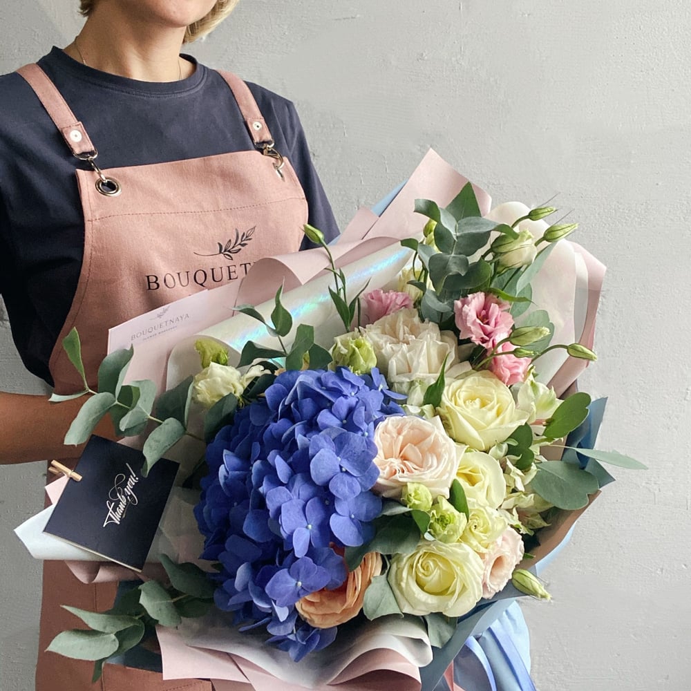 Букет с гортензией из роз и эустом