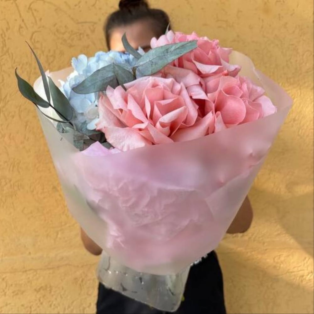 Этот изысканный букет сочетает в себе нежные оттенки гортензии (гидрангии), романтические французские розы и ароматный эвкалипт. Упакован в стильную дизайнерскую упаковку с тишью, этот букет станет прекрасным подарком для особенного человека в вашей жизни.