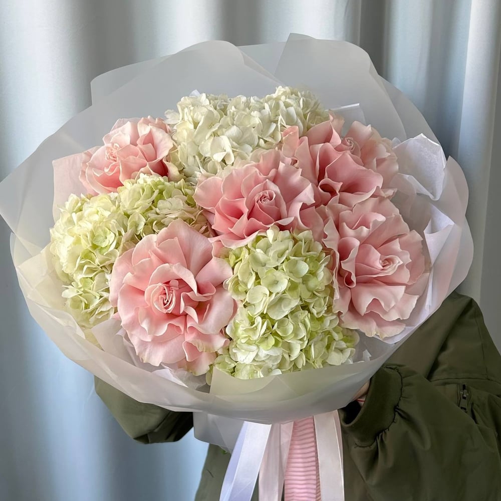 Букет с гортензией и французскими розами