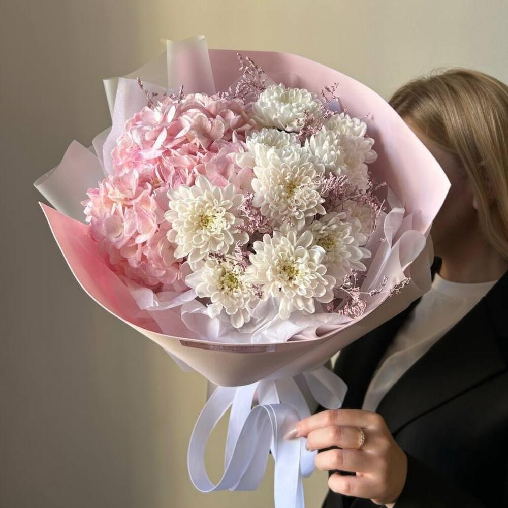 Букет с гортензией и хризантемами