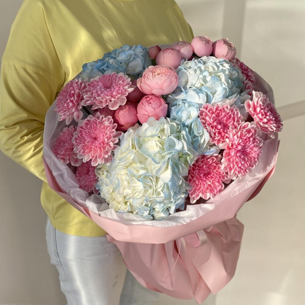 Сочетание пышной гортензии, роскошной пионовидной розы и воздушной хризантемы создает невероятно гармоничный и элегантный букет. Он выглядит объемно, нежно и очень стильно.
