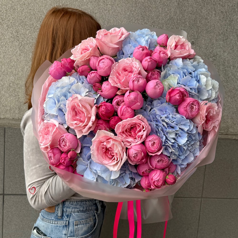 Погрузитесь в мир нежности и элегантности с нашим великолепным букетом, в котором гармонично сочетаются голубая голландская гортензия, ароматные пионовидные розы «Пинк Охара» и изысканная кустовая ...