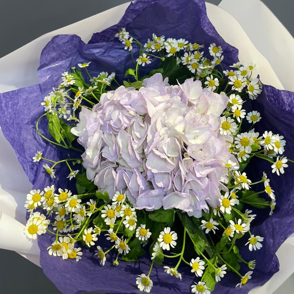 Букет выполнен из яркой воздушной гортензии и ромашки. Это создает яркий и красочный образ, который будет радовать глаз и поднимать настроение. Букет поставляется в упаковке, что делает его готовым…