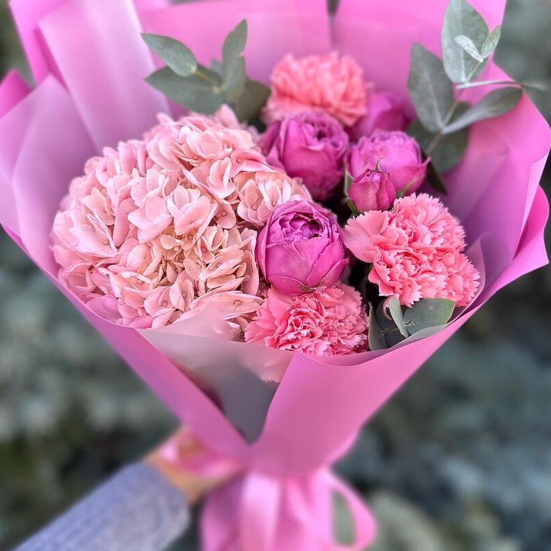 Букет с гортензией, кустовой розой
