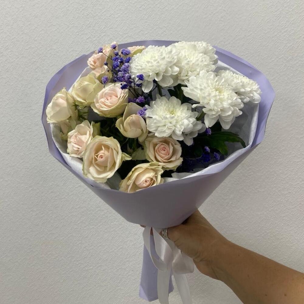 Этот букет — настоящая симфония нежности и изящества. Хризантема в центре словно ласковое комплиментное слово, а лёгкая гипсофила придает ему воздух весеннего утреннего бриза.